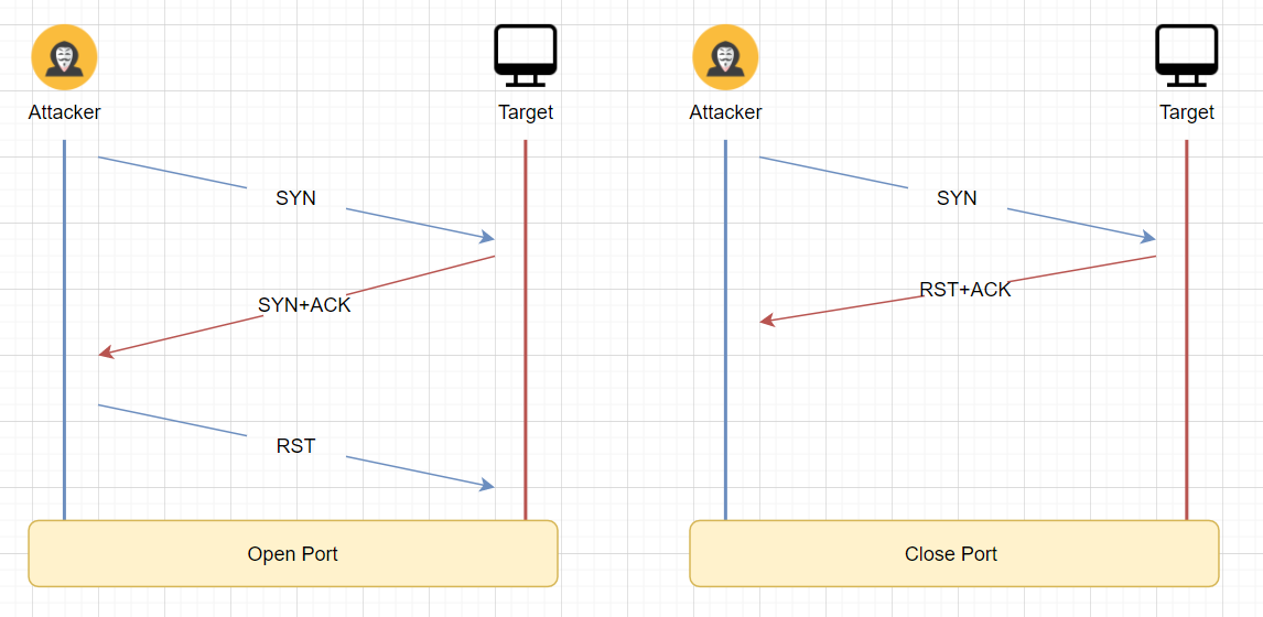 - 포트가 열린 상태면 타켓으로부터 SYN+ACK 응답이 오고 정상적으로 연결할 때 보내는 ACK가 아닌 RST플래그를 설정한 TCP 패킷을 전송하여 연결을 강제로 종료(로그에 안 남음)