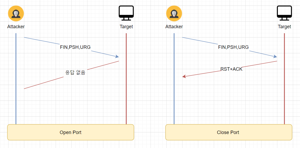 - 연결되어 있지 않은 포트에 일부 제어 비트(FIN, PSH, URG) 또는 전체 제어 비트를 설정한 탐지 패킷을 전송